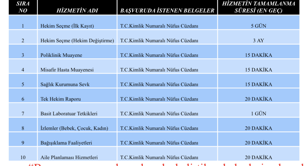 “Başvuru esnasında yukarıda belirtilen belgelerin dışında belge istenmesi, eksiksiz belge ile başvuru yapılmasına rağmen hizmetin belirtilen sürede tamamlanamaması veya yukarıdaki tabloda bazı hizmetlerin bulunmadığının tespiti durumunda ilk müracaat yerine ya da ikinci müracaat yerine başvurunuz.”